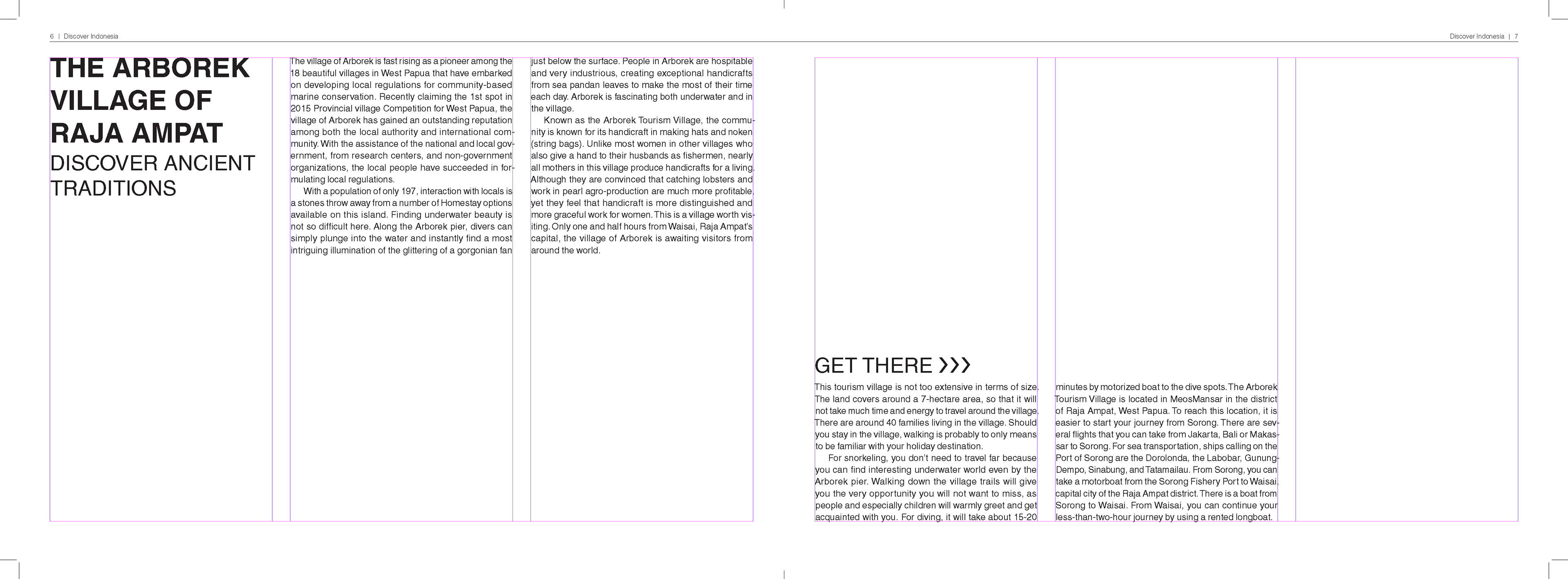 With the exception of the cover page, a single typeface has been used across the document. Inknut Antiqua was chosen for its unique serifs which evoke strokes found on indigenous Indonesian scripts. Helvetica stands in sharp contrast to this, addressing the functional requirements of the document as a travel guide.